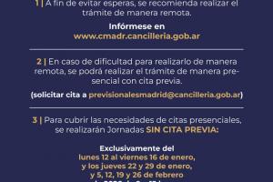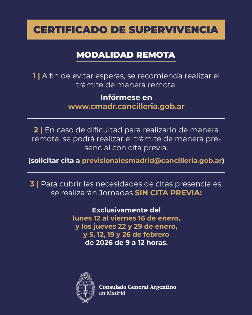 3. Para facilitar la atención presencial, durante los meses de enero y febrero de 2026, podrá tramitar el Certificado de Supervivencia en este Consulado de forma sin cita previa en el horario de 9 a 12 hs. los siguientes días:
